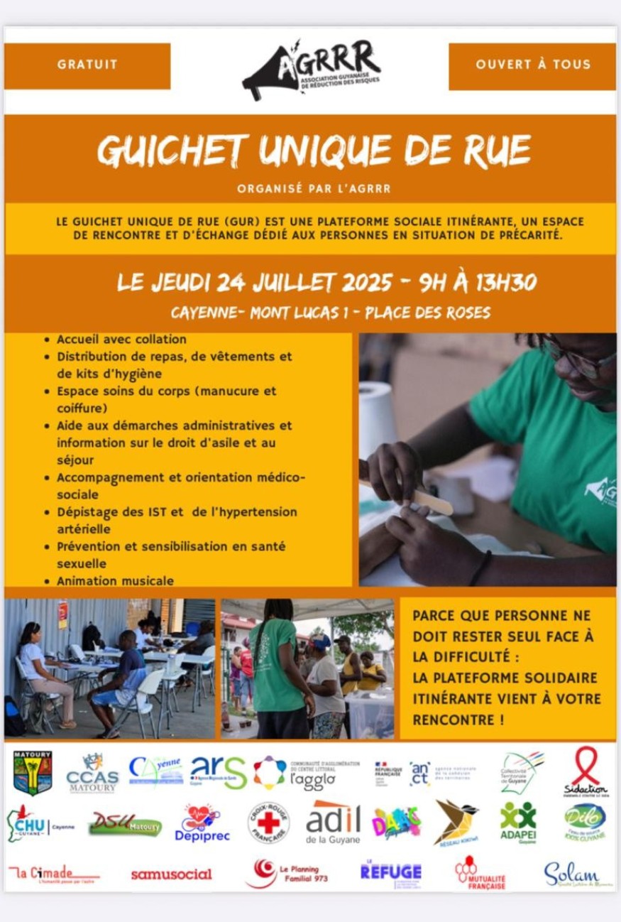 Jeudi 24 juillet 2025, de 9h à 13h30, une belle vague de solidarité déferlera sur le quartier Mont Lucas à Cayenne. À la Place des Roses, un événement rare et précieux prendra vie : le Guichet Unique de Rue, organisé par l’Association Guyanaise de Réduction des Risques (AGRRR), s’installera pour une matinée placée sous le signe de la chaleur humaine, du soin, et de la rencontre.